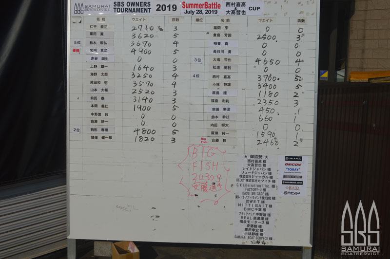 | Rank | Angler | 人数 | Weight | Count | Big Fish | Penalty | Point |