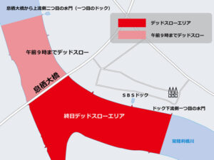 トーナメント中は次のエリアにおいてボート走行に関して制限を設けますので厳守してください。 基本的に、記載の無いエリアに関しても流入河川等はデッドスローエリアとします。 詳しくは「ボート走行制限エリア図」をご参照下さい。 ※走行制限エリアで制限を守らなかった場合、500gのペナルティーとしますのでお気をつけ下さい。 ※デッドスローエリアでの、前船の追い越しはしないで下さい。