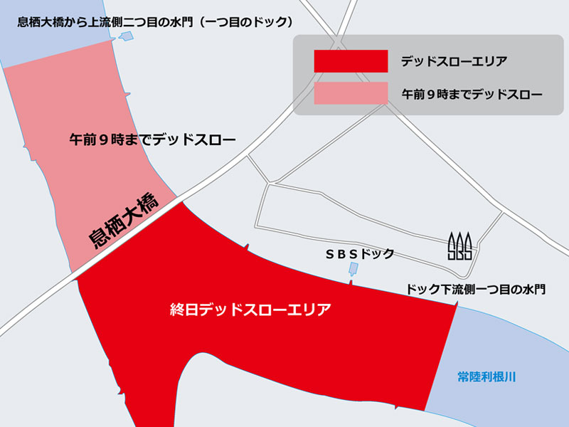 • スタートから9時までは、息栖大橋から上流側二つ目の水門まで(エリア図1参照)