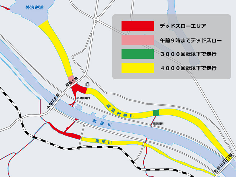 トーナメント中は次のエリアにおいてボート走行に関して制限を設けますので厳守してください。 基本的に、記載の無いエリアに関しても流入河川等はデッドスローエリアとします。 詳しくは「ボート走行制限エリア図」をご参照下さい。 ※走行制限エリアで制限を守らなかった場合、500gのペナルティーとしますのでお気をつけ下さい。 ※デッドスローエリアでの、前船の追い越しはしないで下さい。